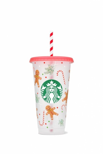 En av våre favoritt-kopper denne sesongen. En utrolig søt og dekorativ gjenbrukskopp for kalde drikker i ekstra stor størrelse (709 ml). Motiv av pepperkaker, candy canes og misteltegn, med et utrolig søt rød- og hvitstripet sugerør.